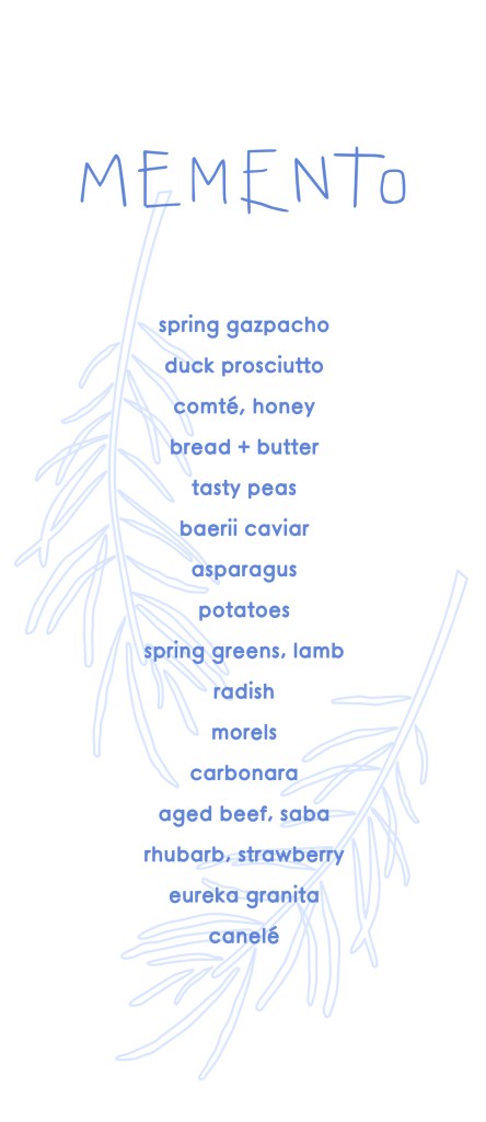 These digitally-created, plotter-rendered menus were created for a private dining experience. The imagery and color scheme parallels the springtime-focused course offerings and meal setting.