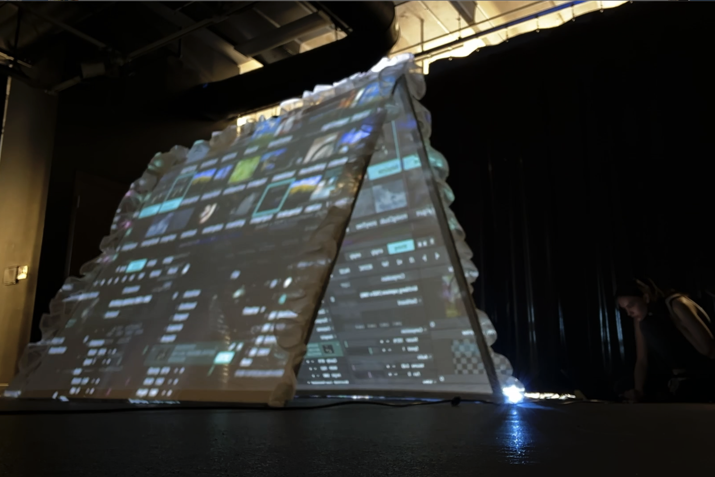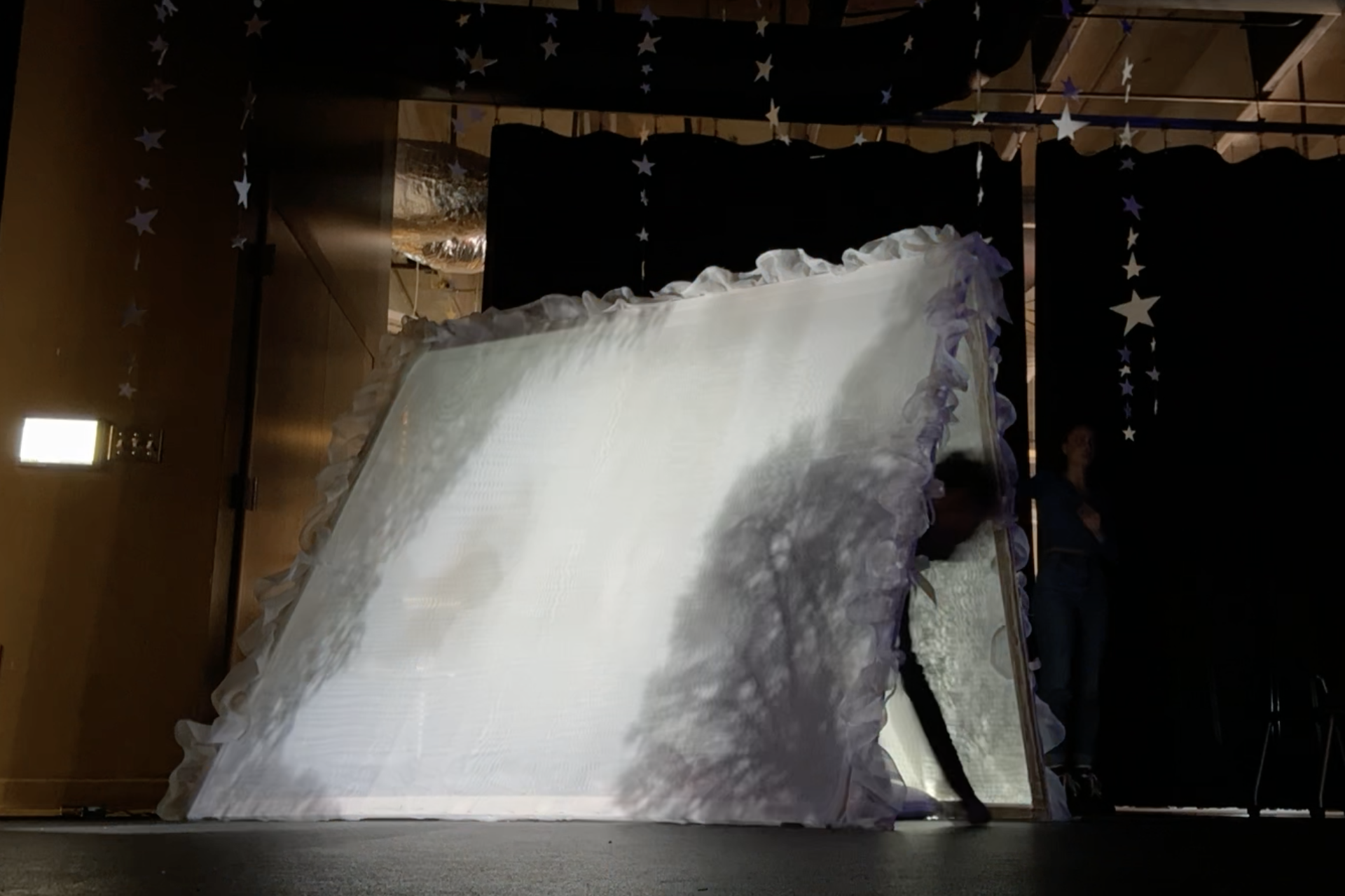 Good Morning Starshine is a multimedia, participatory art installation that invites the audience into a dreamy, faux outdoor environment. The physical installation includes a sky full of white stars hanging above a tent draped with sheer fabric. Projected depictions of joys, fears, and nostalgic memories are painted onto the sides of the tent, with the residual light twinkling onto the overhead stars. Intending to welcome the playful spirit within the audience, Good Morning Starshine gives participants the opportunity to play and engage with their visual and auditory senses.
